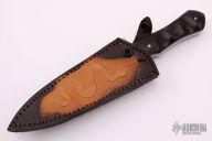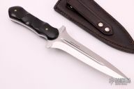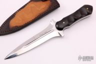This Death Adder by Down Under Knives features a mirror polished double edged blade with fullers, .236" blade stock and 1.225" blade depth measure at where the logo begins, 2.230" blade depth at the guard lugs, full tang construction with ebony scales and brass pins. Comes with a hand tooled brown leather sheath and original box. Excellent condition.