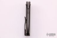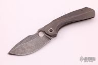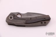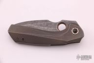 This Alter by Tuff Knives, features dark tumble finished blade with a false top edge and copper Spyderhole. The handle has a tumbled and anodized titanium frame with matching backspacer, tip up blackened titanium clip, super conductor pivot collars, dark titanium hardware. Centered blade seating, smooth action, nice detent and lockup. Excellent condition. Comes with COA dated 2019.