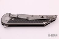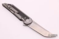 This UHEP frame-lock flipper by Jake Hoback has a stonewashed upswept/tanto blade, notched thumbrest and flipper. CBP caged bearing pivot. Handle is carbon fiber and titanium with carbon fiber inlay on the lockside, stonewashed titanium tip up clip and backspacer, clip is reversible left or right. This knife has an adjustable detent. Nice detent, lockup, and blade seating, and flips like a boss. Knife is in excellent condition and shows no signs of use. Comes with a zippered case. Excellent condition.