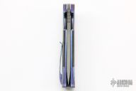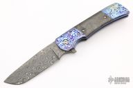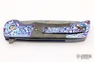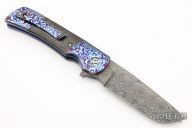 This full dressed Rucus linerlock flipper by Clark Blades features a Damascus blade with notched thumbrest and flipper. The handle has timascus bolsters, marble carbon fiber scales, anodized titanium liners, timascus tip up clip and floating Damascus backspacer. Comes with a zippered case and COA dated 6-9-17. Nice detent, lockup and blade seating, rides on bearings. Excellent condition.