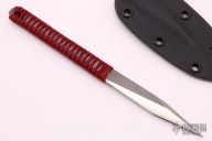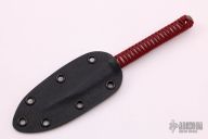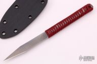 This Devil Dart by Matt Gregory features a spear point chisel ground blade with .141" blade stock and .535" blade depth, full tang construction with red epoxied cord wrap. Comes with a leather lined kydex sheath. Excellent condition.