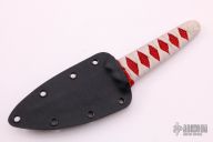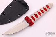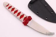 This Kwaiken by Matt Gregory features a satin finished blade with .098" blade stock 1.118" blade depth, hidden tang construction. The handle has a red cord turk's head knot, red rayskin with white cord wrap overlay.  Includes a kydex sheath.  Excellent Condition.