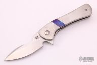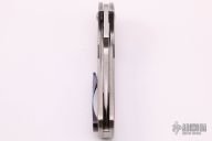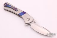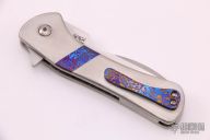This Gambit by Olamic Cutlery is a Serge Panchenko design, it features a satin finished blade with flipper. The handle has satin finished titanium scales with timascus bands, jeweled titanium liners, titanium backspacer and timascus tip up clip. Includes padded and zippered case. Marked "Gambit G027" inside backspacer. Has a couple light scratches, otherwise excellent condition.