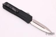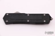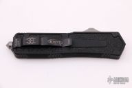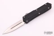 This Scarab OTF automatic by Microtech knives has a satin finished double edge blade. The handle has a black aluminum frame with non-slip inlays, black stainless steel clip, bead blasted hardware and glass breaker. Dated 01/2005 and s/n 0296. Excellent condition. Comes with original sheath.