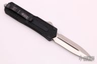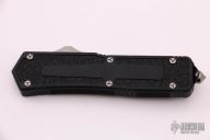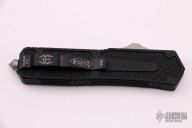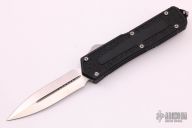 This Scarab OTF automatic by Microtech knives has a satin finished double edge blade. The handle has a black aluminum frame with non-slip inlays, black stainless steel clip, bead blasted hardware and glass breaker. Dated 12/2004 and s/n 0130. Excellent condition. Comes with original sheath.