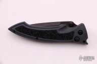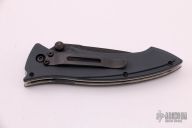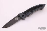 This knife by Masters of Defense features a black tanto blade with false top edge and dual thumbstuds. The handle is black polymer with a tip down black stainless clip, safety on the spine and push button. Has a couple light scuffs, otherwise excellent condition.