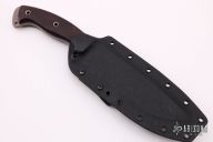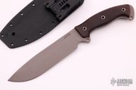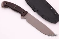 This Steel Heart Ergo from Busse Combat Knife Company features a desert sage coated drop point blade, .257" blade stock and 1.747" blade depth, full tang construction. The handle has maroon canvas micarta scales with hollow pins. Exposed tang with lanyard hole. Comes with a kydex sheath by Buy Brown. Excellent condition.