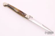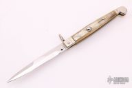This Sicilian Ring Pull Stiletto from AGA Campolin features a mirror polished bayonet ground blade. The handle is comprised of nickel silver bolsters and ring pull with honey horn scales over brass liners and stainless steel backspacer. Has some side to side blade play in the open position. Includes a padded zippered case. Excellent condition.