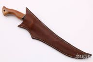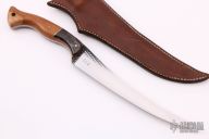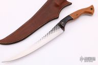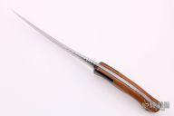 This Fillet/Boning Knife by CLB Creations features a satin finished blade made from a farrier's rasp, .211" blade stock and 1.216" blade depth, full tang construction. The handle has cherry wood scales with buffalo horn inlaid bolsters with a nickel silver band and pins. Comes with a brown leather sheath. New from maker.