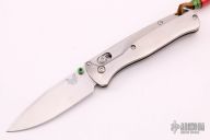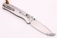 The Benchmade Custom Bugout features a drop point blade with a stonewashed finish. It's a manual opener with ambidextrous thumb studs. This AXIS lock has custom titanium handles with a mini deep-carry pocket clip, and a lanyard hole. Excellent condition. Comes with a cloth pouch.