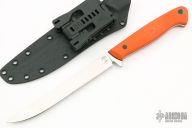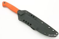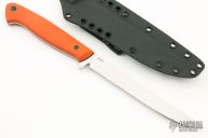 This Coho Fillet Knife by Tom Krein features a satin finished blade with .130" blade stock and .779" blade depth, full tang construction. The handle has orange G-10 scales with black liners and pins. Comes with a kydex sheath with TekLok. Dated 2021. New from maker.