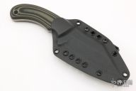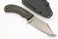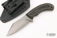 This Seaxy Bulldog by Tom Krein features a acid washed blade with notched thumbrest, .186" blade stock and 1.415" blade depth, full tang construction. The handle has black/green G-10 scales with black liners and pins. Comes with a kydex sheath with TekLok. Dated 2021. New from maker.