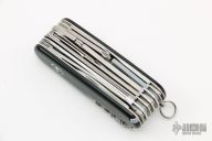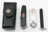 Swiss Champ by Victorinox. Excellent condition. Includes leather sheath with flashlight, thermometer, compass, magnifying glass and ruler.