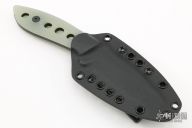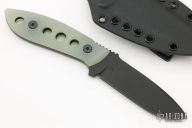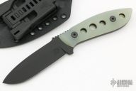 This K9 Model 6 by Krein Knives features a black Cerakote blade with notched thumbrest, .188" blade stock and 1.177" blade depth, full tang construction. The handle has jade G-10 scales with black hardware. Comes with a kydex sheath with TekLok. New from maker.
