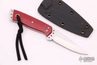 This neck knife by Al Polkowski features a satin finished blade with notched thumbrest, .118" blade stock and .762" blade depth, full tang construction. The handle has red G-10 scales. Comes with kydex neck sheath. Has a few light scratches, otherwise excellent condition.