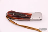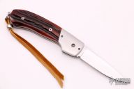 This Bolster Release Auto by Mike Whiskers Allen features a mirror polish 416 stainless blade with fileworked spine. The handle has bead blast finish dovetailed bolsters, amber jigged bone scales, fileworked stainless steel liners and backspacer. "03 W 03" inside backspacer. Nice action, lockup and blade seating. Has some light scratches, otherwise excellent condition.