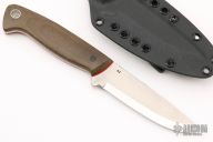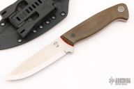 This Bushcraft XL by Tom Krein features a satin finished blade with notched thumbrest, .125" blade stock and 1.112" blade depth. The handle has green canvas micarta scales with red liners, black pin and an aluminum lanyard tube over full tang construction. Includes Kydex sheath with TekLok. New from maker.