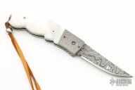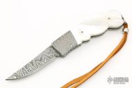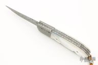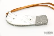 This Bolster Release Auto by Mike Whiskers Allen features a Mike Morris Damascus blade with fileworked spine. The handle has Spirograph Damascus dovetailed bolsters, Mother of Pearl scales, fileworked stainless steel liners and backspacer. "04 2001" inside backspacer. Nice action, lockup and blade seating. Excellent condition.