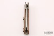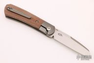 This Apache Front Flipper was designed by Enrique Pena, manufactured by Reate Knives and features Lee Williams Kickstop.  This knife features a satin finished blade with notched thumbrest and flipper tab.  The handle has titanium bolsters, brown micarta scales with a titanium backspacer and a titanium tip up pocket clip.  The knife opens with the use of Lee Williams' Kick Stop flipper.  Includes a Pena X-Series padded box. Brand new from maker.