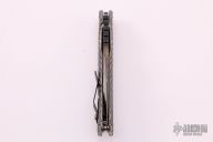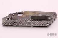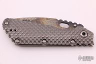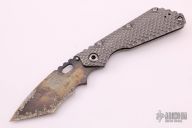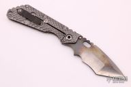 This Mick Strider custom SMF framelock folder has a chisel ground tanto Strike Plate Titanium blade with notched thumbrest and thumbhole. The handle has a double gunner grip titanium frame with black titanium clip. Includes Hinderer "Lock Bar Stabilizer" for maximum reverse lock retention. Nice lockup, blade seating and detent. New from maker at the 2021 CCKS. Comes with velcro case.