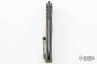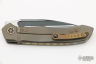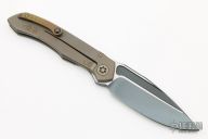 This Anax by Marfione Custom Knives features a blued W2 blade with notched thumbrest and hamon. The handle has an integral bronzed titanium frame. Tip up titanium clip with silicon nitride ball bearing. Nice detent, lockup and blade seating. Comes with original box, COA and zippered case. Dated 10/2014 and S/N 16. Excellent condition.