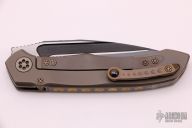 This Anax by Marfione Custom Knives features a blued W2 blade with notched thumbrest and hamon. The handle has an integral bronzed titanium frame. Tip up titanium clip with silicon nitride ball bearing. Nice detent, lockup and blade seating. Comes with original box, COA and zippered case. Dated 10/2014 and S/N 15. Excellent condition.