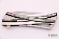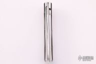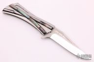 This Closer by Koji Hara features a mirror polished blade with bamboo motif carved flats and a notched flipper. The handle has a bamboo motif carved stainless steel scales and backspacer, jeweled stainless liner and black lip pearl inlays. Nice detent, lockup and blade seating. Comes with a zippered case. Excellent condition.