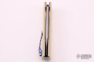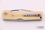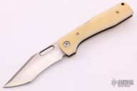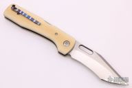 This Specialist lockback by Jim Burke features a satin finished blade with thumbhole. The handle has Westinghouse ivory paper micarta scales, titanium liners, matte finished stainless steel lockbar, mokuti backspacer and tip up clip. Excellent condition. Comes with a zippered case.