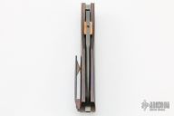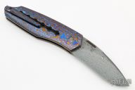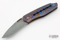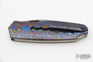 This Potenza 3.0 by GTC features a Chad Nichols Stainless Damascus blade with a checkered copper thumbdisc that runs through the blade and can be accessed by both sides. The handle has a black Timascus frame and tip up clip with anodized titanium screws and an orange peel finished titanium lockbar with checkered release. Rides on bearings, nice lockup, action and blade seating. Comes with a zippered case with COA dated 2019. Excellent condition.