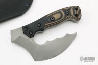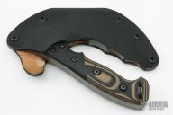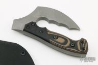 This knife by Kazutoshi Tanabe features a bead blast finished blade, .485" blade thickness and 5.75" blade depth, Full tang construction. The handle has black G-10 bolsters and black/tan G-10 scales. Comes with a leather lined kydex sheath. Great feel in the hand. Has some light scuffs on the bead blast, otherwise excellent condition.