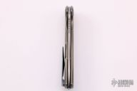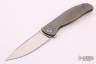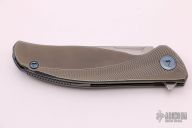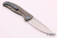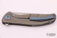 This Touch F95 by Shirogorov Knives features a stonewashed blade with a notched thumbrest and flipper. The handle has a blasted and milled titanium frame with anodized titanium backspacer and tip up clip. Nice detent, lockup and blade seating. Has MRBS. Comes with original leather case and COA #26. Excellent condition. Comes with a Shirogorov Bit Driver and a Cova Design leather pouch. Originally from the 2021 CCKS. M398 Blade Steel
