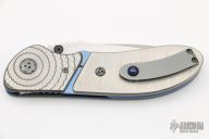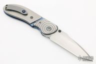 This Linerlock by Allen Elishewitz features a hand rub satin finished blade with notched thumbrest and single thumbstud. The handle has guilloche titanium bolsters, orange peel finished titanium scales, anodized titanium liners and floating backspacer with textured edges, tip up bead blasted stainless steel clip with roller ball. Nice detent, blade seating, and lockup. Excellent condition. Comes with a zippered case.