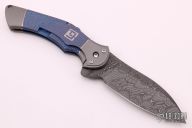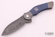 This Custom Junkyard Dog by Tim Galyean features a Damascus blade with notched flipper. The handle has a two-tone jigged titanium frame with matching tip down clip. Rides on bearings, nice detent, lockup and blade seating. Comes with a zippered case. Excellent+ condition.