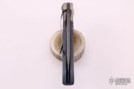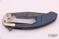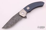 This Custom Lahar by Tim Galyean features a Damascus blade with notched flipper and thumbrest. The handle has a two-tone jigged titanium frame with a satin finished titanium tip down clip. Rides on bearings, nice detent, lockup and blade seating. Comes with a zippered case. Excellent+ condition.