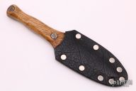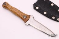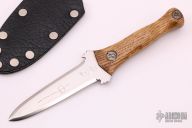 This Dagger by Phill Harsfield features a double edged blade, .092" blade stock and 1.062" blade depth, full tang construction. The handle has wooden scales. Comes with a black leather sheath and a zippered case. Excellent condition.