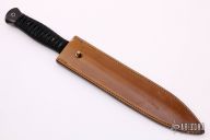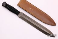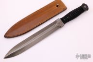 This large dagger by Barry Dawson features a gun blued satin finished double edged blade, .255" blade stock and 1.492" blade depth, full tang construction. Handle is black canvas micarta black cord wrap, lanyard hole and notched thumb rests. Comes with brown leather sheath. Excellent condition.