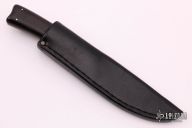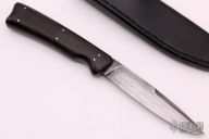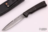 This Hunter from Wayne Goddard features a Cable Damascus drop point blade with .177" blade stock and .768" blade depth, hidden tang construction. The handle is comprised of black micarta. Includes a black leather sheath with belt loop and a zippered case. Excellent condition.