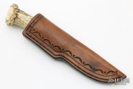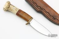 This Skinner from Wayne Goddard features a polished drop point blade with file worked spine. The handle is comprised of a copper guard and wood and crown stag handle over hidden tang construction, .178" blade stock and 1.107" blade depth. Includes leather sheath with belt loop and a zippered case. Sheath marks on blade, and patina on guard, but otherwise excellent condition.