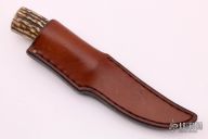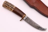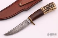 This Skinner from Wayne Goddard features a Damascus blade. The handle is comprised of a copper guard and ironwood and stag handle with a mokume butt over hidden tang construction, .177" blade stock and .896" blade depth. Includes leather sheath with belt loop and a zippered case. Excellent condition.