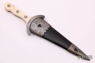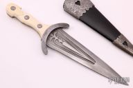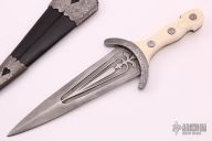 This dagger features a carved double edged Damascus blade with .215" blade stock and 1.972" blade depth, mortise frame tang construction. The handle has a Damascus guard, mammoth ivory scales with Damascus frame and pins. Comes with a black leather covered wooden scabbard with fileworked Damascus fittings. Has some light oxidation throughout as well as some scratches. Interesting piece. Good condition.