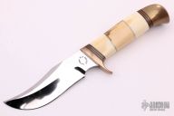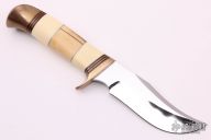 This hunter by DE Friedly features a mirror polish blade with a nearly sharpened top edge, .247" blade stock and 1.380" blade depth, hidden tang construction. The handle has a brass guard and butt cap, and polished 3-piece walrus ivory grip with black linen micarta and brass spacers. Comes with a zippered case. Excellent condition. This is a really nice piece, feels great in hand and is just really nicely done.