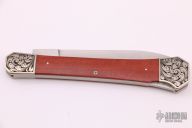 This large lockback folder by Mel Pardue features a hand rub satin finished dagger ground blade with false top edge and a nail nick. The handle has engraved nickel silver bolsters signed "HL", front and rear, wood scales, nickel silver liners, stainless steel backspacer. Nice lockup. Excellent condition.