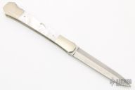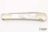 This large lockback folder by Mel Pardue features a hand rub satin finished dagger ground blade with false top edge and a nail nick. The handle has nickel silver bolsters, front and rear, mother-of-pearl scales, nickel silver liners, stainless steel backspacer. Nice lockup. Has some patina and some light scratches, otherwise excellent condition. #001 on the blade.