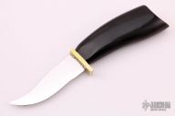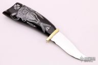 This knife by Ted Miller features a mirror polished upswept blade, .090" blade stock and .921" blade depth, hidden tang construction. The handle has a brass guard and a buffalo horn grip with the scrimshaw of a buffalo skull. It comes with an antler stand. #B19 on blade and COA.  Excellent condition.