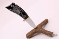 Cherokee Knife Maker, Ted Miller is an American Indian Artisan, of Miami-Peoria-Cherokee heritage. He has won over fifty significant awards. He carves images of his heritage and culture from stories passed down through his ancestors. Ted makes the handles for his knives from natural shed Deer and Elk Antler enhanced with semiprecious stones such as turquoise, coral, and onyx. Black handles are made from Buffalo horn. The blades for the knives are hand-shaped, sharpened, polished and heat-treated individually from 440C stainless steel, 56-60 Rockwell, and acid etched designs are worked on the larger blades . Stands shown are included in the price. All knives are shaped and balanced to provide a perfect grip for the sportsman as well as the ultimate in arts acquisition for the collector. Some handles may be similar in nature or design but each is an original piece with no two being exactly alike. Each knife is individually numbered and comes with a certificate of authenticity