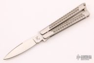 This Utility Balisong by 29 Knives features a satin finished utility blade with swedge and satin finished 303 stainless steel ball mill pattern handles. Excellent work. Has a few very light scratches, otherwise excellent condition. Comes with original box, zipper pouch, warranty, and handwritten specifications.