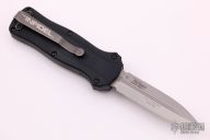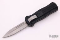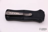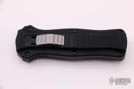 This 3350 Mini-Infidel by Benchmade features a bead blasted, double edge dagger style blade with fullers. The handle is comprised of a black anodized aluminum frame, ramped steel thumb slide and steel tip down clip. First production run #416/500. Excellent condition.