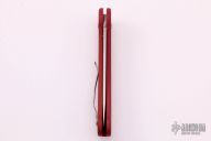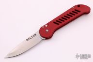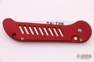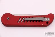 This Slotted Seal Side Opening Auto by Rob Dalton has a satin finished drop point blade with swedge. Handle is red anodized aluminum with slots, bead blasted stainless steel tip up clip, and lanyard hole. Excellent condition.
