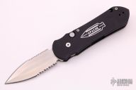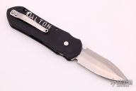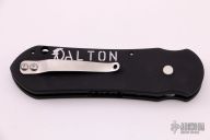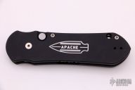 This Apache by Rob Dalton features a satin finished double edged blade with partially serrated edges, close carefully. The handle has an aluminum frame with a tip up stainless steel clip, left or right reversible. Excellent condition.