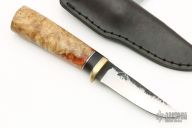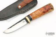 This Custom Hunter by Murad Custom Knives features a hand rub satin finished blade with forge finished flats, .214" blade stock and .910" blade depth, hidden tang construction. The handle has a brass guard with an amboyna burl grip with stainless steel and rosewood spacers. Comes with a black leather sheath and COA. New from maker.
